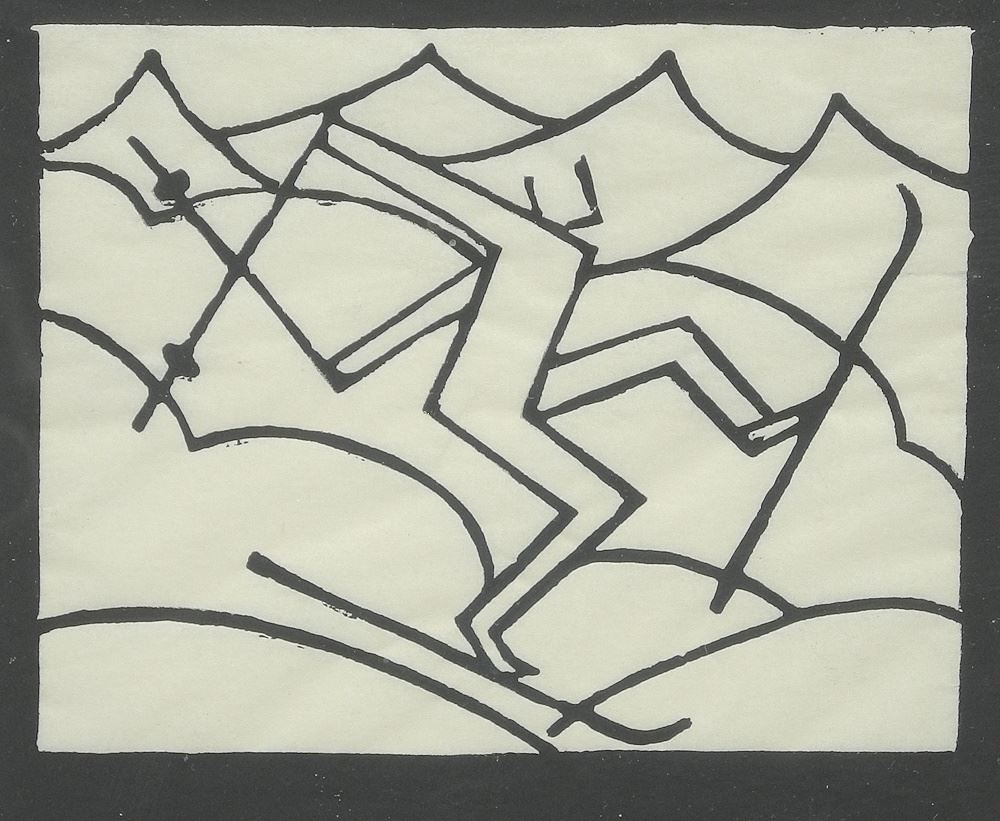 Block Print signed Helen B. Stadelbauer, 5 x 5", "Ski Dancer".