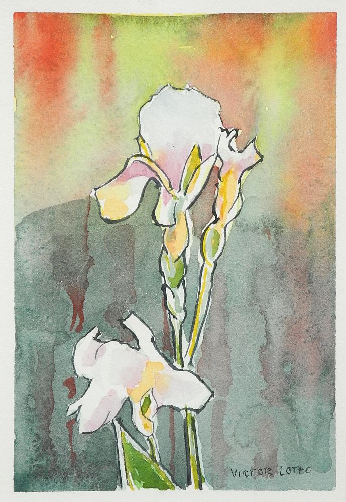 Watercolour signed Victor Lotto, 6 1/2 x 4 1/2", "Irises".