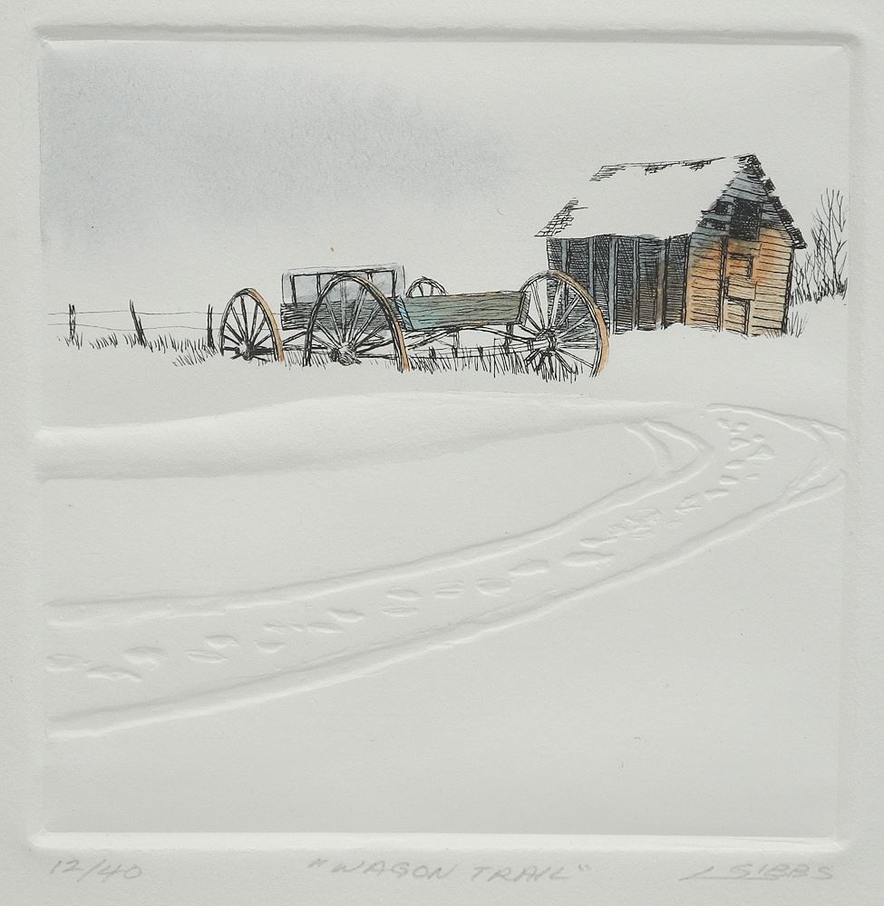 LOT 49 Coloured Drypoint signed L. (Len) Gibbs, Plate 5 3/4 x 5 3/4", "Wagon Trail" #12/40. Estimate: $80 - $120 Sold For: $70 Auction Date: Tuesday, June 24 2025 at 4:00 PM