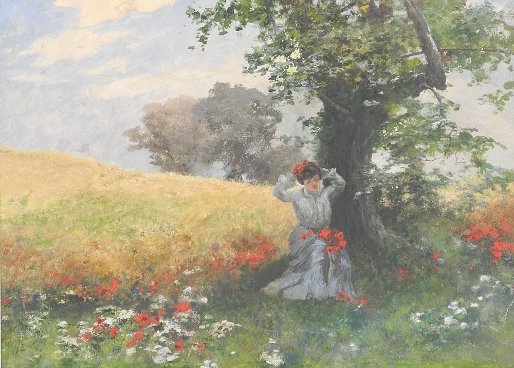 LOT 112 Oil on Paper Attributed to Pal Szinyei-Merse, 11 1/2 x 15 1/4", "Girl with Poppies in Hair Estimate: $150 - $300 Auction Date: Tuesday, June 24 2025 at 4:00 PM