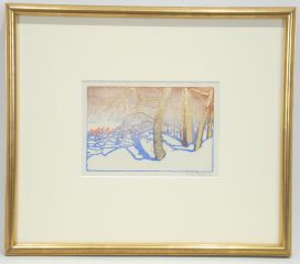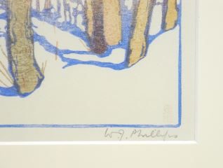 LOT 13 Woodblock Print signed W.J.(Walter Joseph) Phillips, 4 1/2 x 6 1/2", "Tree Shadows on Snow". Estimate: $600 - $900 Sold For: $800 Auction Date: Tuesday, August 26 2025 at 4:00 PM
