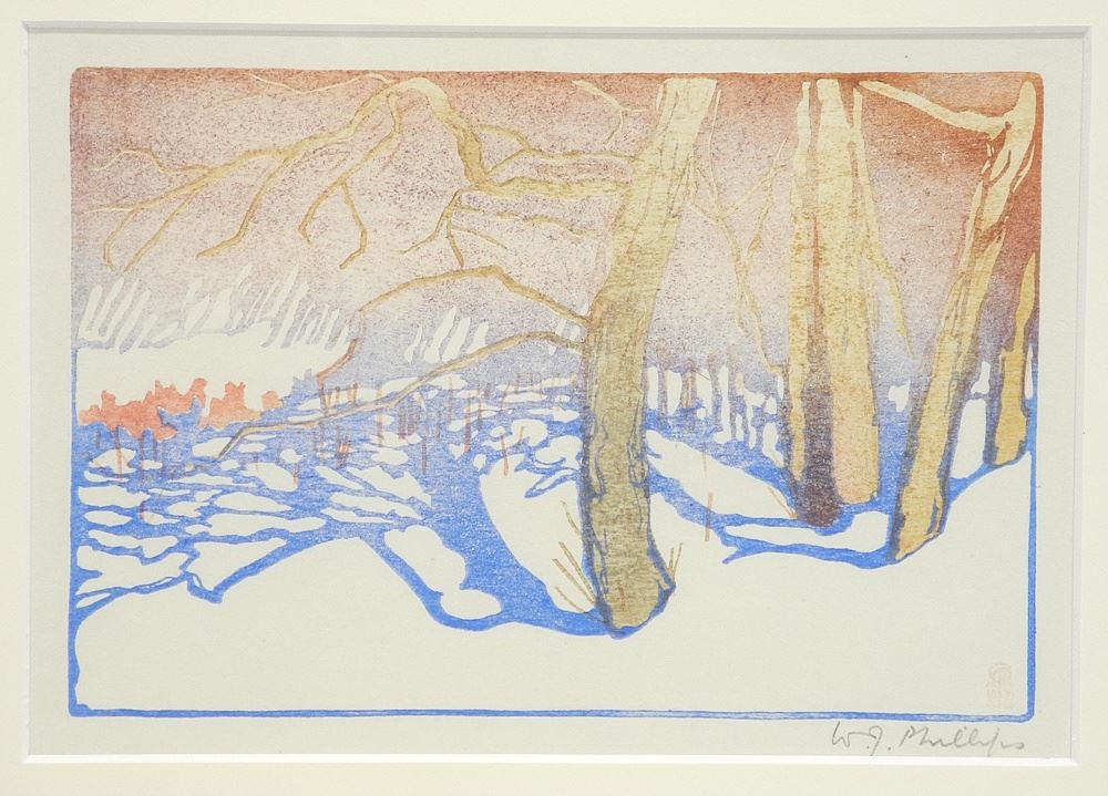 Woodblock Print signed W.J.(Walter Joseph) Phillips, 4 1/2 x 6 1/2", "Tree Shadows on Snow".
