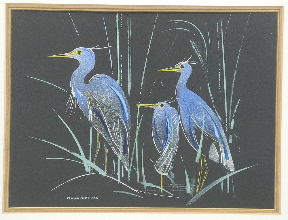 Watercolour on Gouache signed R.N. (Robert Newton) Hurley 1965, 11 1/8 x 15 1/4", "Herons".
