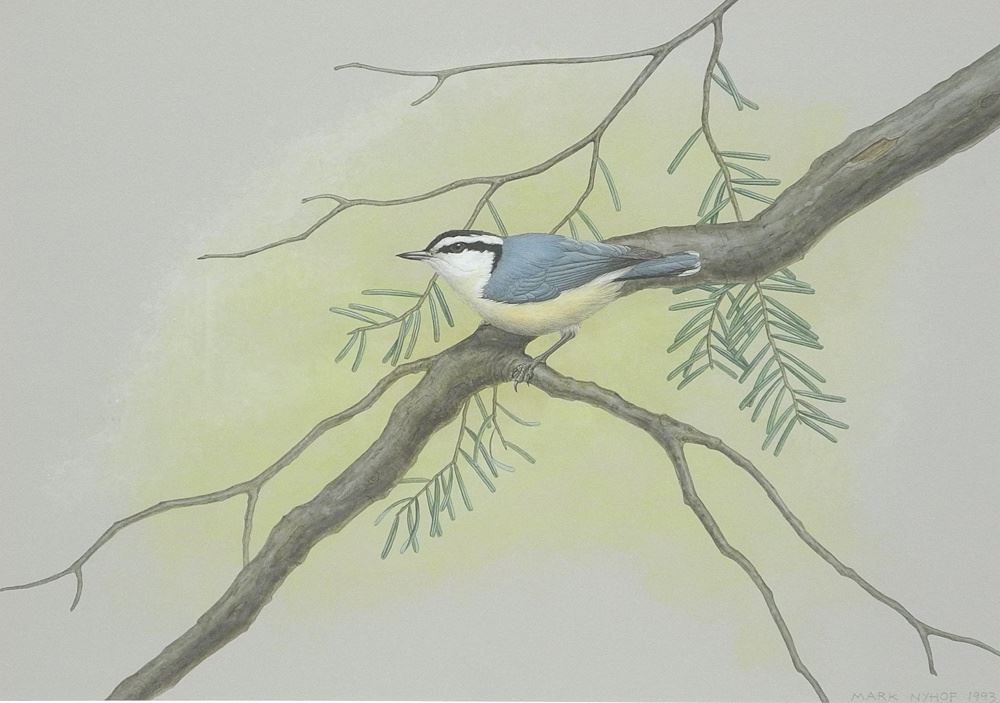 LOT 60A Watercolour & Gouache signed Mark Nyhof 1993, 8 7/8 x 12 5/8", "Nuthatch". Estimate: $100 - $200 Sold For: $100 Auction Date: Tuesday, August 26 2025 at 4:00 PM