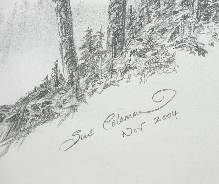 LOT 40 Drawing signed Sue Coleman Nov.2004, 6 1/8 x 9 1/8", "Coastal Scene with Totems". Estimate: $60 - $100 Sold For: $100 Auction Date: Tuesday, August 26 2025 at 4:00 PM