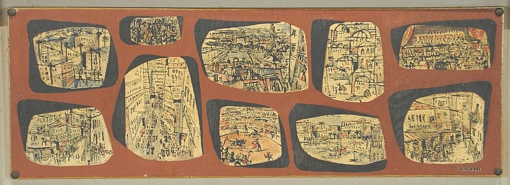Mixed Media on Board signed H. (Herbert) Siebner, 9 1/4 x 27", "Cities of the World" 1956
