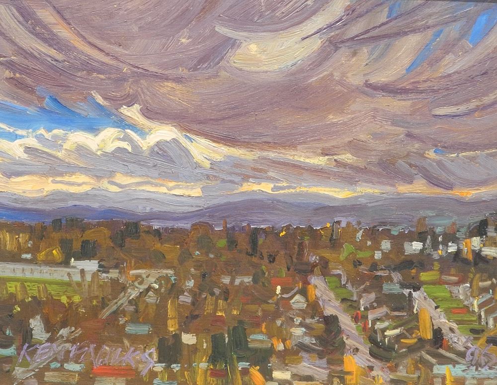 Oil on Board signed Ken Faulks, 7 5/8 x 9 1/2", "West View From Mt. Tolmie, Rainclouds".