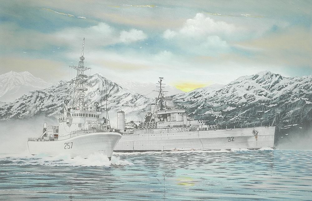 LOT 47 Pastel on Paper signed P. (Pierre) De Wispelaere, 23 1/2 x 35 1/2", "HMCS Ontario & Restigouch Estimate: $150 - $300 Sold For: $275 Auction Date: Tuesday, August 26 2025 at 4:00 PM