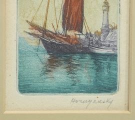 LOT 33 Etching with Aquatint signed (Nicholas) Hornyansky, 3 5/8 x 2 3/8 " (toning noted). Estimate: $60 - $100 Sold For: $70 Auction Date: Tuesday, August 26 2025 at 4:00 PM