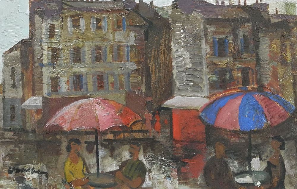 Oil on Canvas signed (Bertil) Wahlberg, 15 1/2 x 24", "Parisian Cafe Scene".