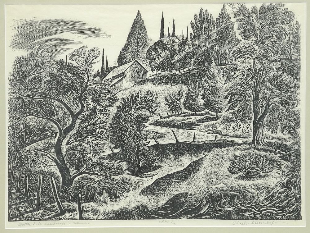 LOT 109 Linocut signed Charles Surendorf, 12 1/2 x 16 3/4", "Motter Lake Landscape". Estimate: $60 - $100 Sold For: $130 Auction Date: Tuesday, August 26 2025 at 4:00 PM