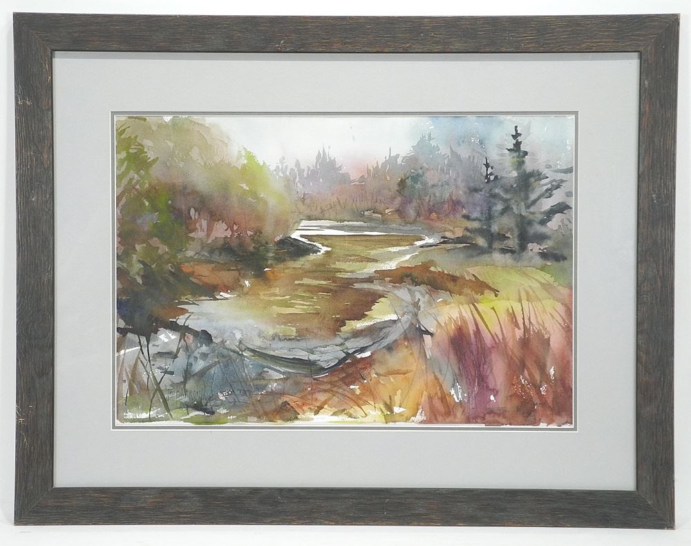 Watercolour signed Jesi Barron '14, 14 x 20 1/2", "Autumnal Riverway".