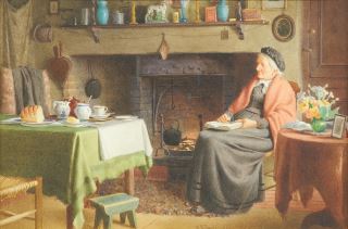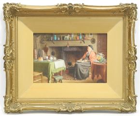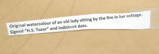 LOT 86 Watercolour signed H.S.(Henry Spernon) Tozer, 8 1/4 x 12 1/2", "Old Lady by the Fire". Estimate: $100 - $200 Sold For: $275 Auction Date: Tuesday, December 16 2025 at 4:00 PM