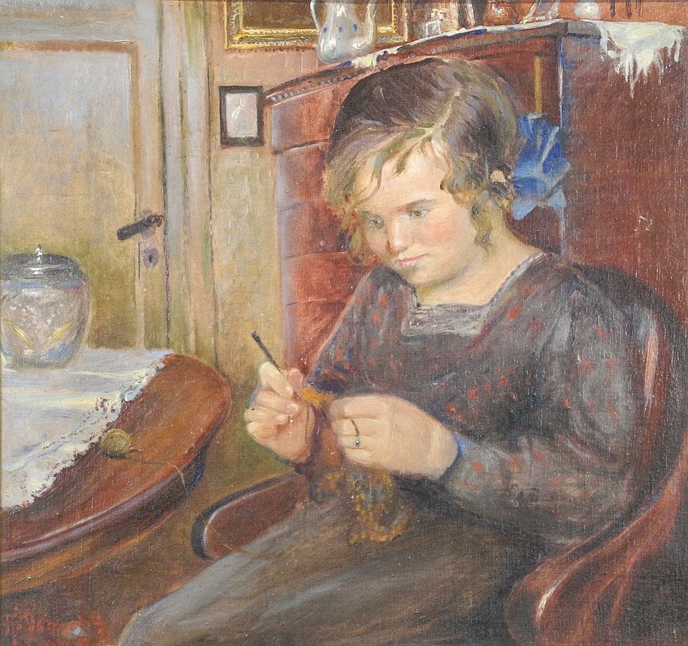 Oil on Board signed H. Denholm, 18 1/2 x 19 1/2", "Young Girl Crocheting".