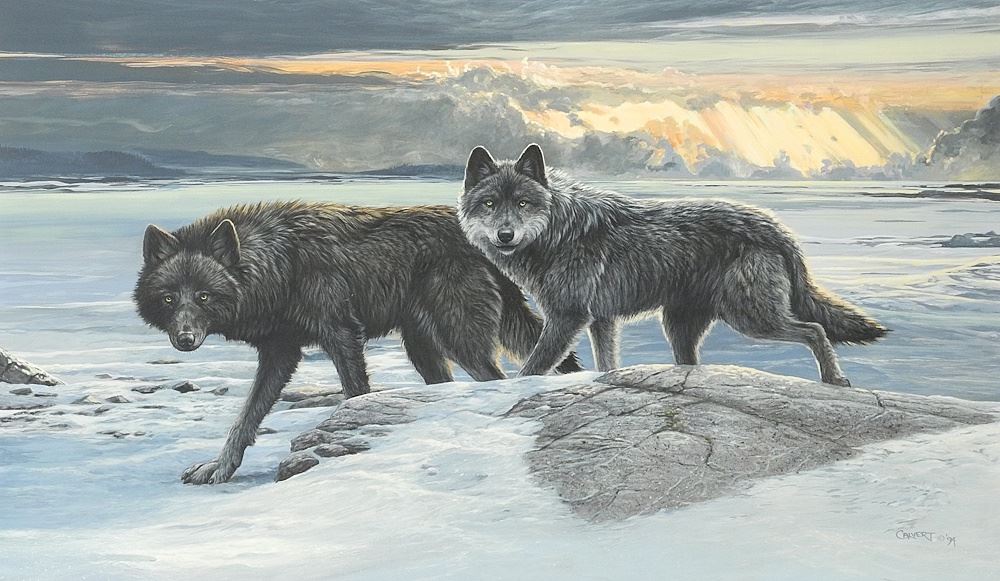 Acrylic on Board signed (Lissa) Calvert, 17 1/2 x 29 1/2", "Pair of Wolves".