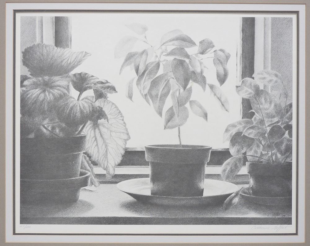 Lithograph signed Catherine Moffat, 15 1/8 x 19 1/2" "Plants on Window Sill".