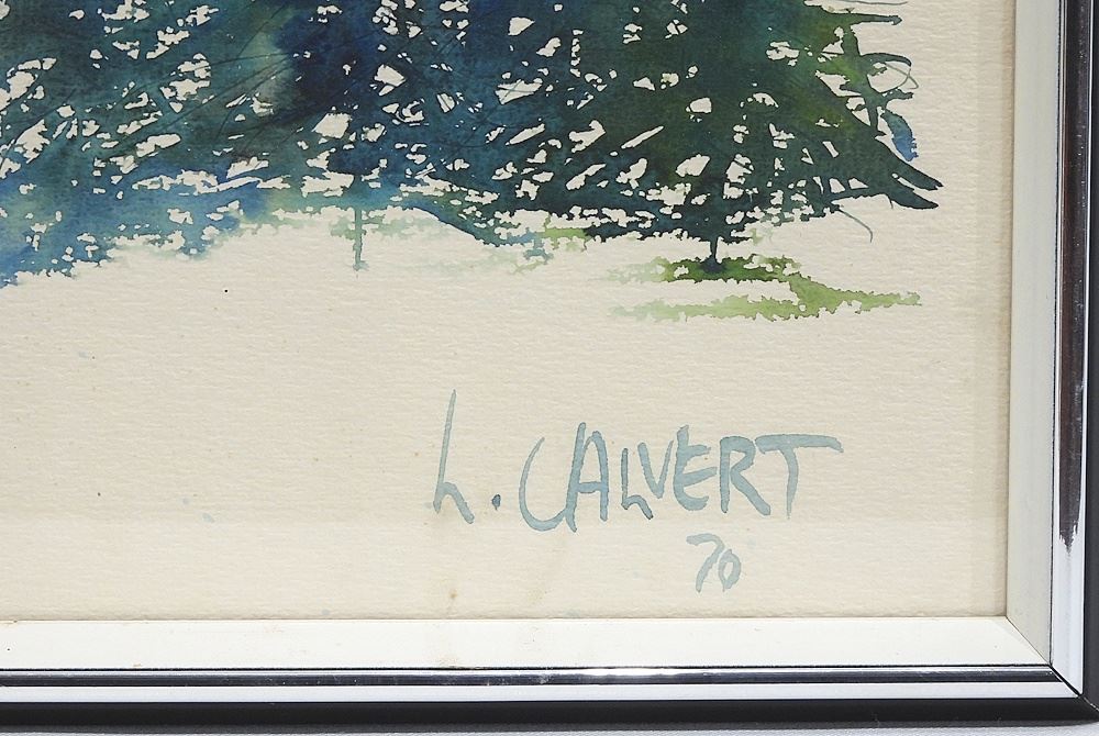 Watercolour signed L. (Lissa) Calvert '70, 21 1/2 x 14" "Sky & Trees".