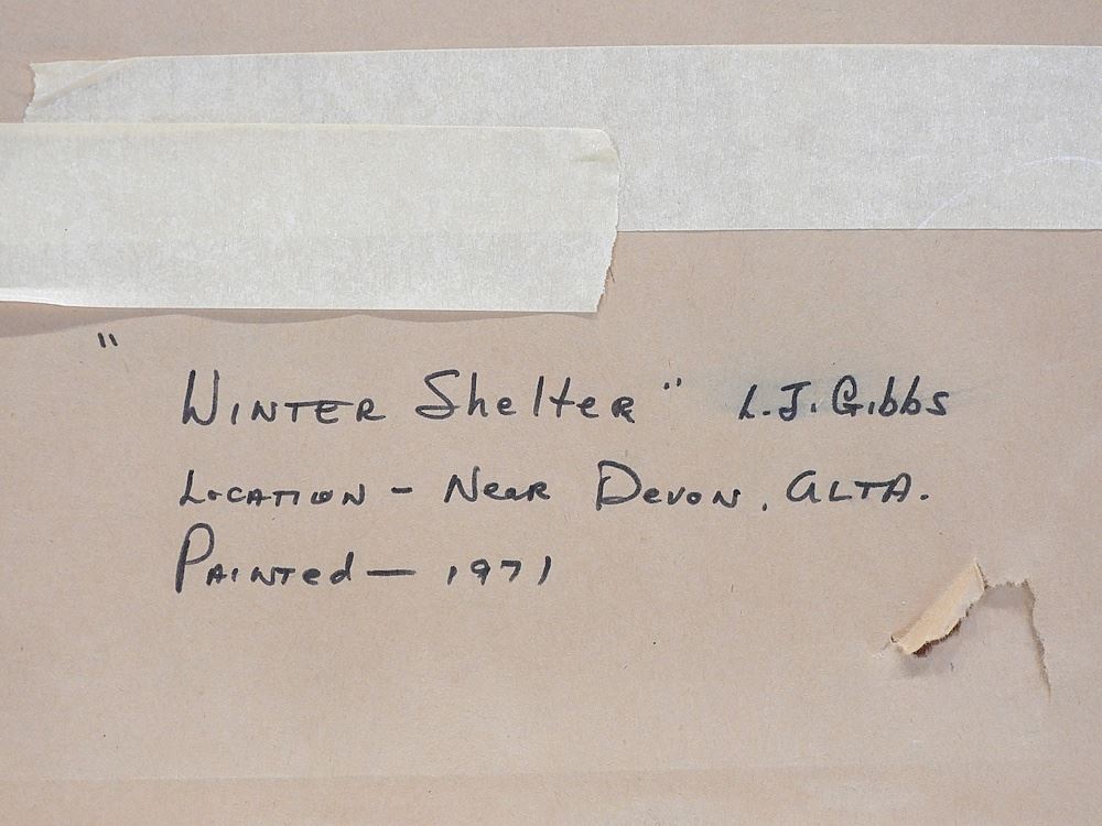 Watercolour signed Len Gibbs, 9 3/4 x 11 3/4" "Winter Shelter" 1971.