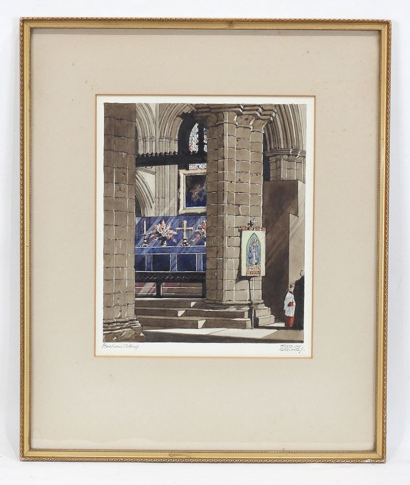 Watercolour signed Fred Jay Girling, 8 1/4 x 7" "Hexham Abbey".