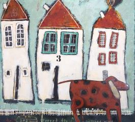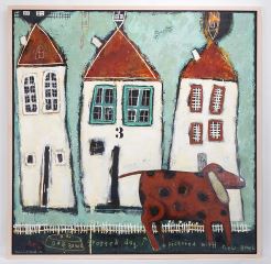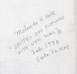 LOT 6 Oil on Canvas signed Melinda K. Hall 98', 44 x 44" "Spotted Dog Pictured with New Bowl". Estimate: $600 - $1,000 Auction Date: Tuesday, April 28 2026 at 4:00 PM