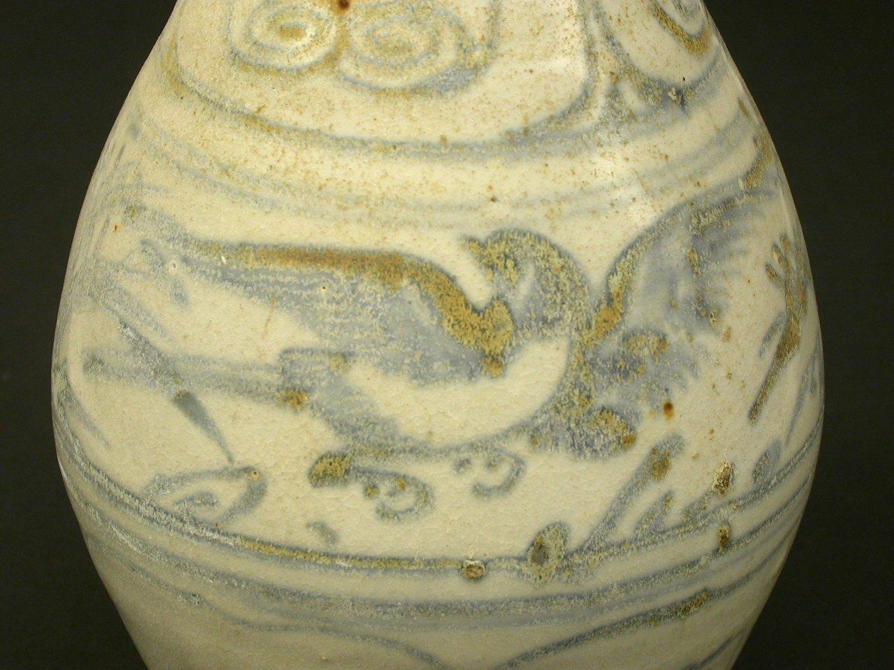 Large blue and white bottle with bird design.