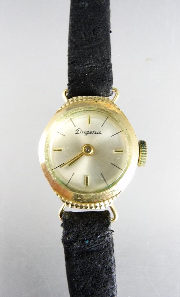 LOT 478 14k yellow gold Dugena ladies wrist watch. Estimate: $50 - $75 Sold For: $45 Auction Date: Tuesday, June 24 2014 at 6:00 PM