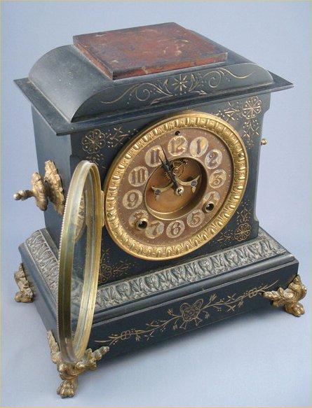 19th. century decorated black metal mantel clock with ormolu handles and feet.
