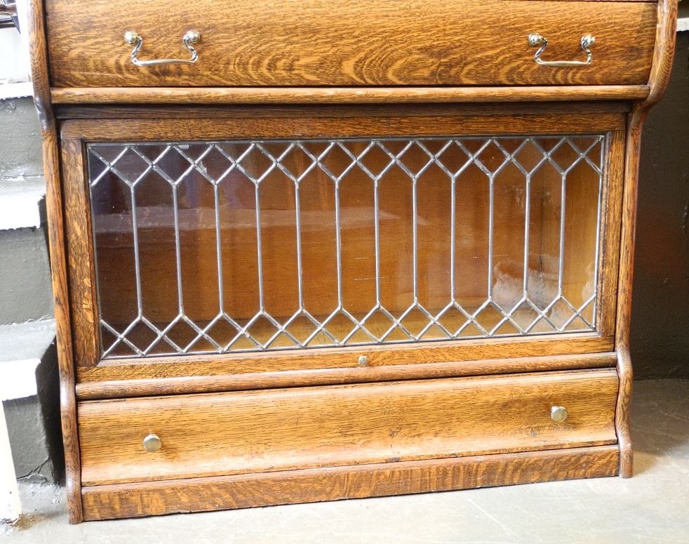 Simulated oak bureau with leaded glass bookcase base.