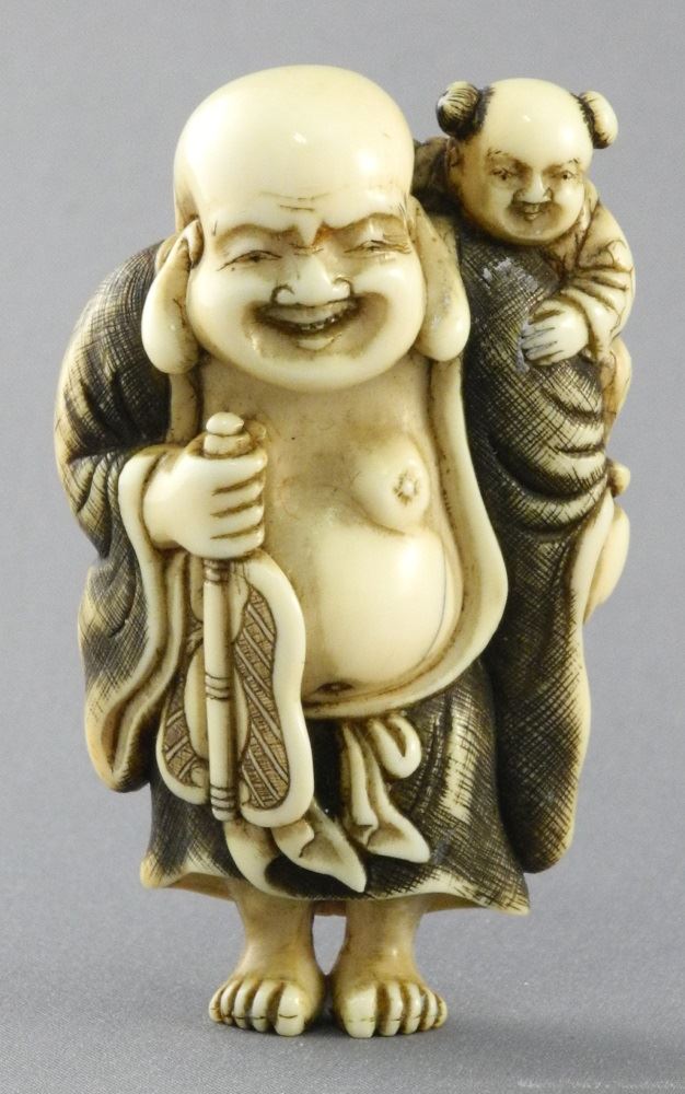 18th C. ivory signed Okimono, Ho Tai with a child, 2 1/4".