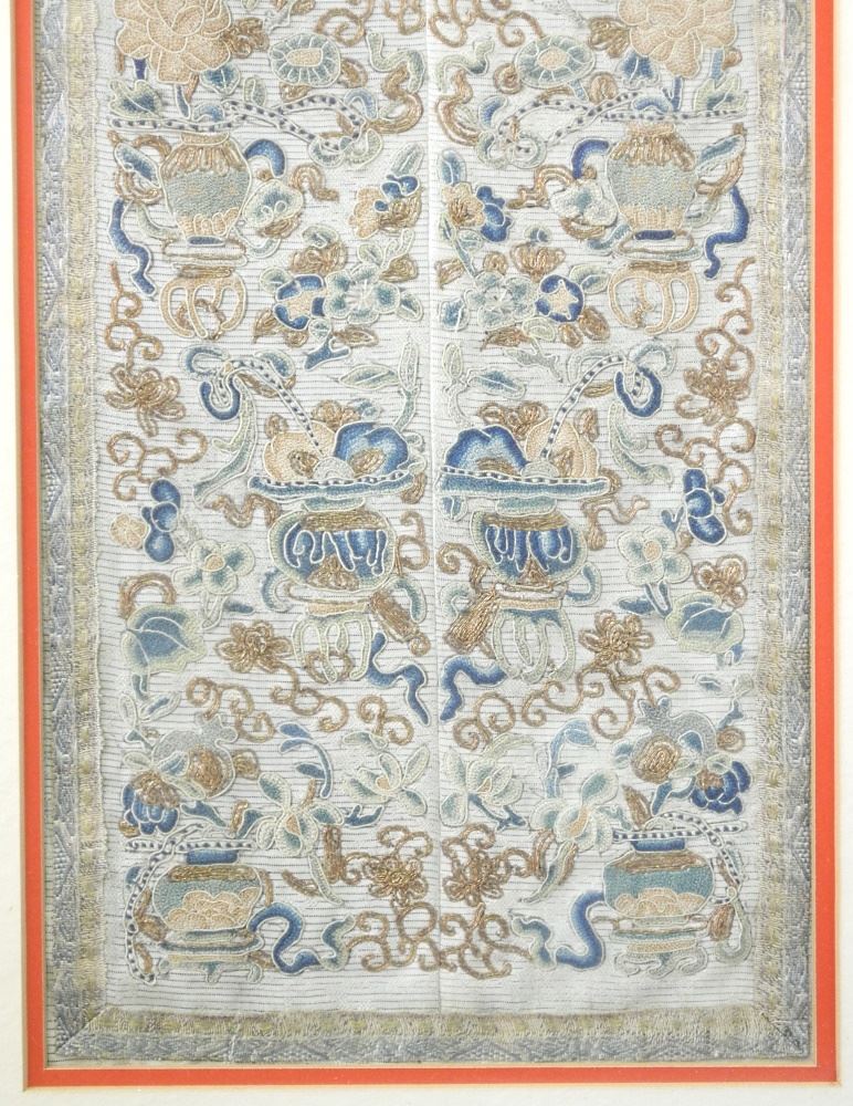 Pair of Qing Gauze & Silk Sleeve Panels, Framed, 22" x 8 3/4".