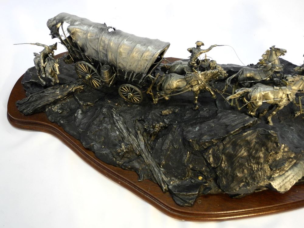 LOT 81 Pewter Western Diorama Signed Michael Boyett, 8" x 26" x 14", "The Unconquered", 149/150. Estimate: $1,000 - $2,000 Auction Date: Tuesday, April 26 2022 at 6:00 PM