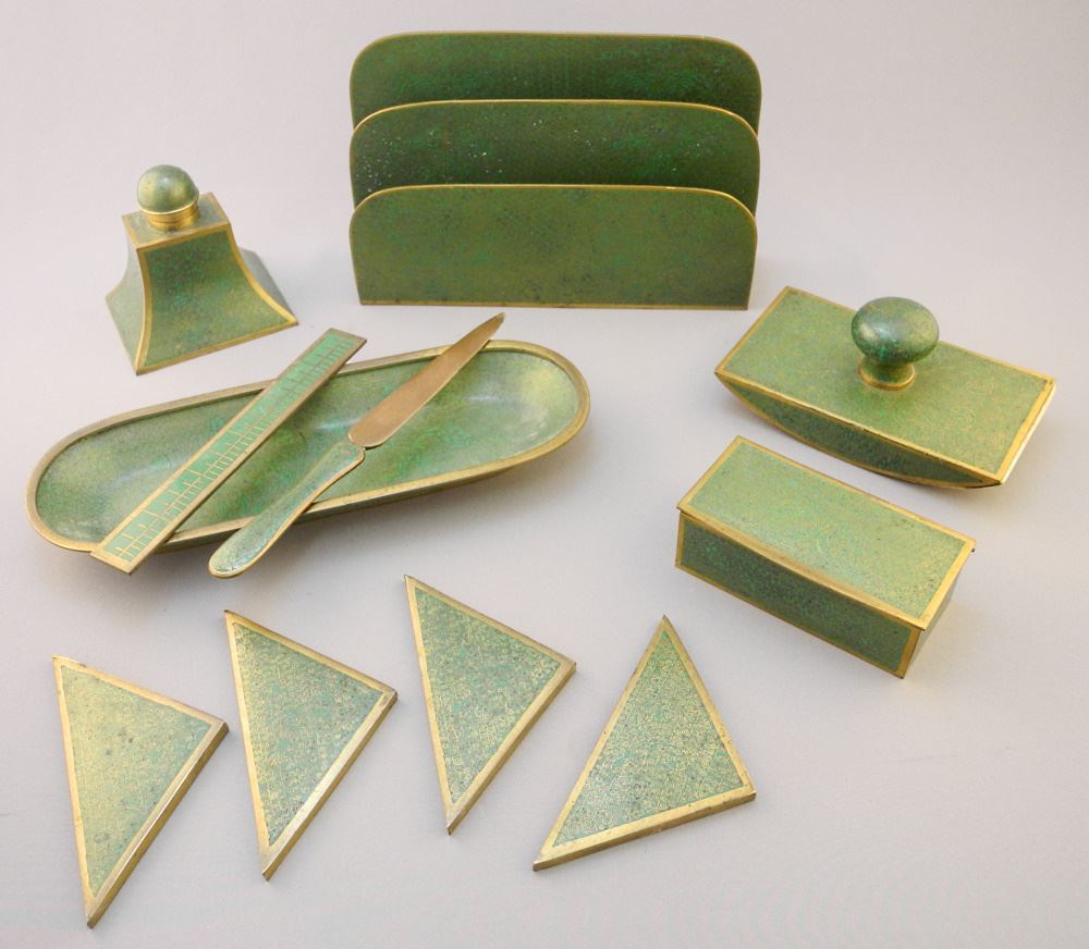 LOT 101 6 Pc. Chinese Green Ground Cloisonne Desk set, Letter Rack 7 5/8" wide. Estimate: $300 - $500 Auction Date: Tuesday, June 20 2023 at 4:00 PM