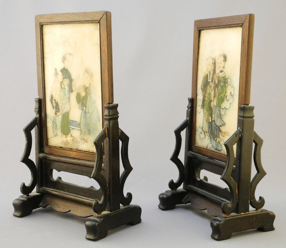 Pr. of Chinese Rosewood & Painted Marble Table Screens, loose joins, 8 7/8" x 5" x 3 1/8".