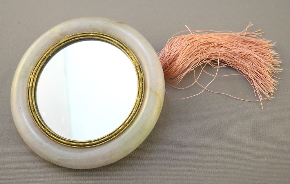 Chinese Bronze & Jade Handle Hand Mirror, 3 1/2" diameter.