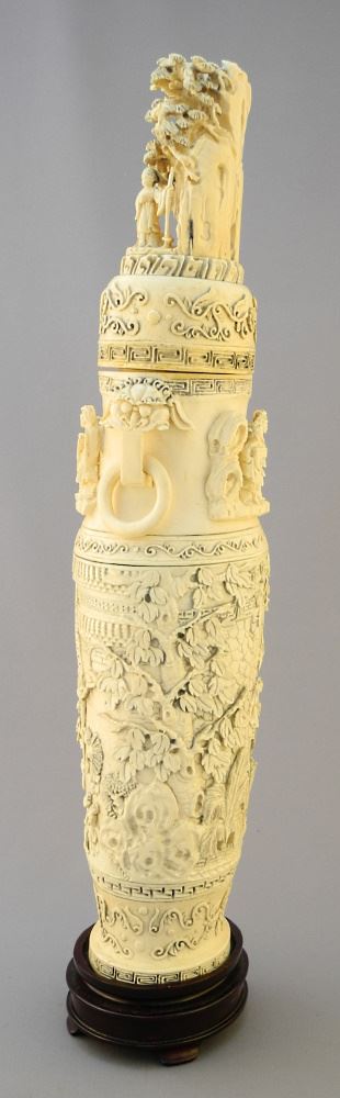 Chinese Elaborately Carved Ivory Covered Vase with Stand, 16 1/4"h., No Export.