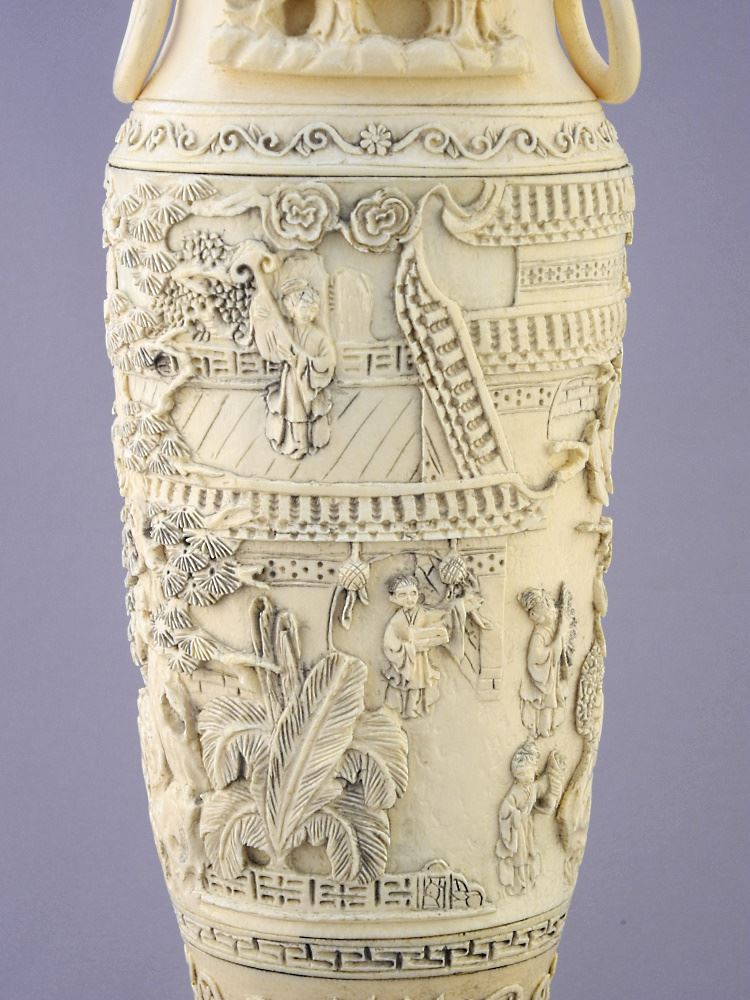 LOT 3 Chinese Elaborately Carved Ivory Covered Vase with Stand, 16 1/4"h., No Export. Estimate: $2,000 - $3,000 Sold For: $3,000 Auction Date: Tuesday, June 20 2023 at 4:00 PM