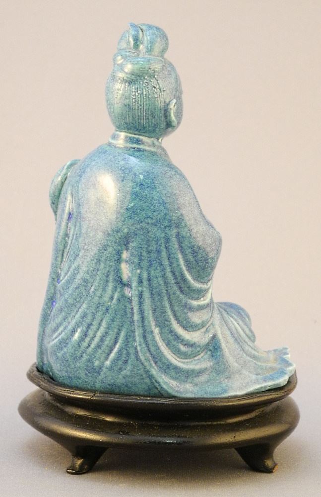 Chinese Qing Robin's Egg Blue Luohan Holding Fuchen with Stand, Figure 4 x 3 3/8 x 3"