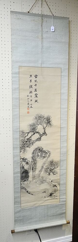 LOT 68 Ink Scroll Attributed to Taizan Hine, Sight 49 3/4" x 14 3/4", "Tiger Under Pine". Estimate: $200 - $400 Auction Date: Tuesday, June 25 2024 at 4:00 PM