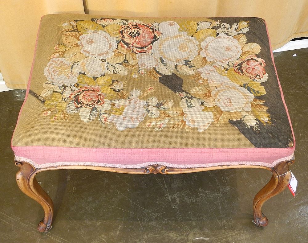 LOT 49 Fruitwood Louis XV Stool with Needlepoint Cover, 18 1/2" x 28" x 20 1/2". Estimate: $100 - $200 Sold For: $100 Auction Date: Tuesday, June 25 2024 at 4:00 PM