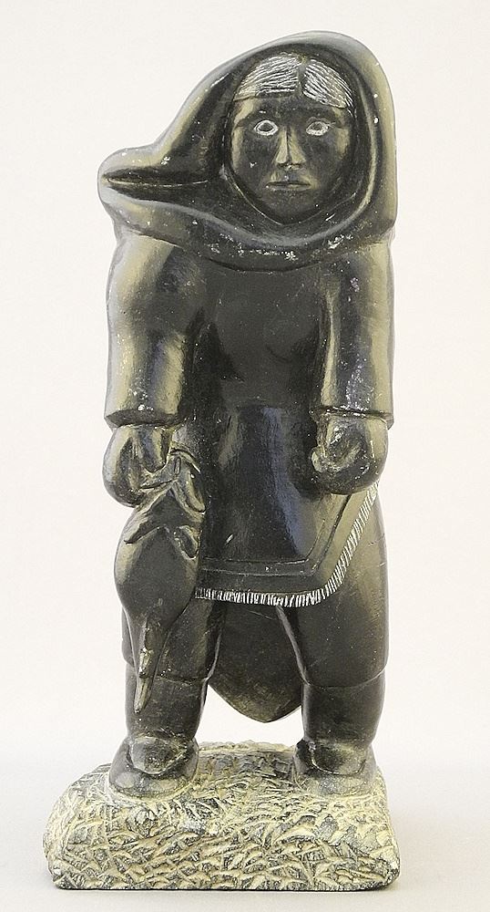 Inuit Sculpture signed Syollie Weetaliktuk, 9"h, "Figure with Fish"