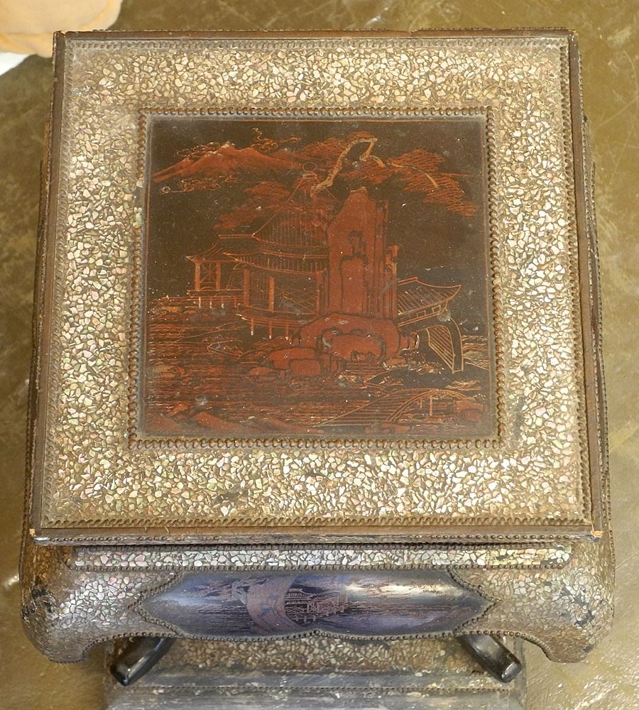 Mother of Pearl Inlaid Stand with Box, 17" x 11 1/2" x 11 1/2".