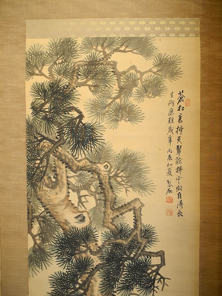 Japanese Ink & Colour Scroll Attributed to Kinseki Mori, Sight 49 1/2" x 17", "Pine, Rock