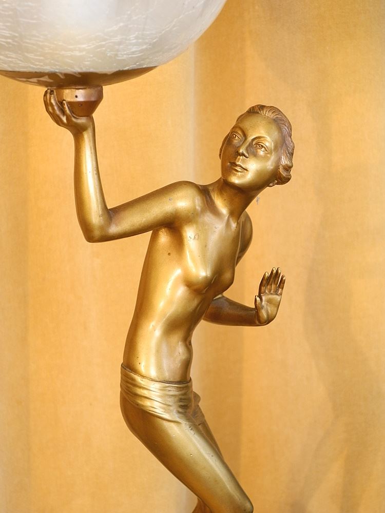 Art Deco Figural Table Lamp Supporting a Globe, 24"h.