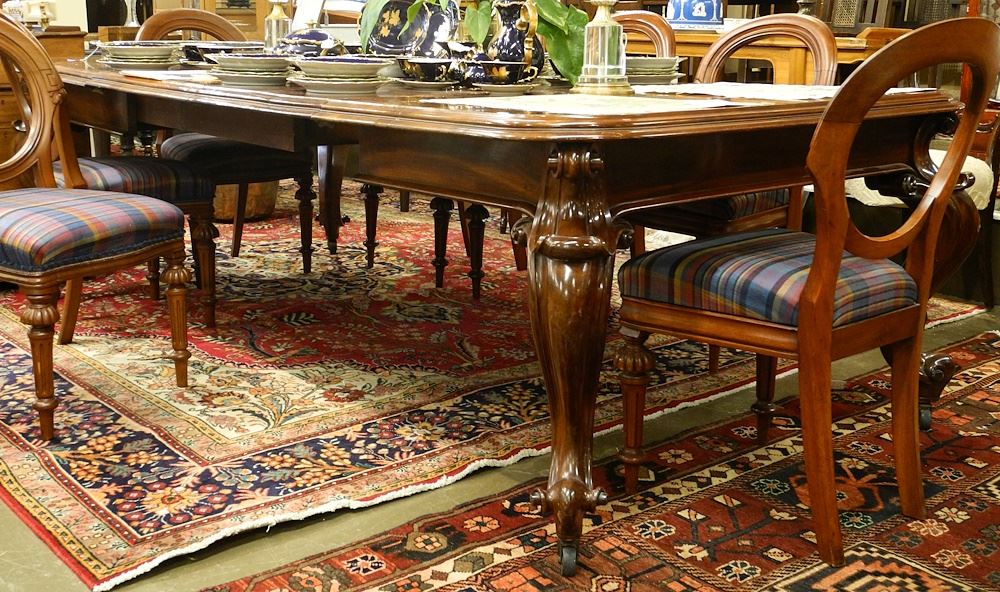 Mid 19th C. Mahogany Dining Table with 3 Leaves & 8 Chairs.