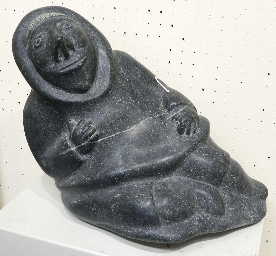 LOT 62 Inuit Stone Sculpture signed with Syllabics Pauloosie Karpik, 13 1/2" x 18 1/2" x 10", "Reclinin Estimate: $300 - $500 Sold For: $400 Auction Date: Tuesday, June 25 2024 at 4:00 PM