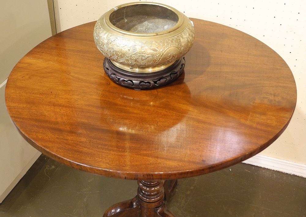 LOT 121 Georgian Mahogany Tilt Top Table with Bird Cage Feature, 28 1/2"h. Estimate: $150 - $250 Sold For: $225 Auction Date: Tuesday, February 25 2025 at 4:00 PM