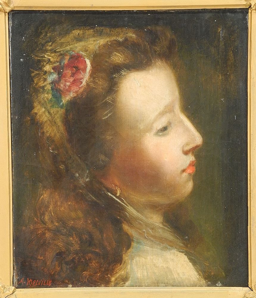 Oil on Canvas signed Verso Alexander Melville, 14 x 12", "Portrait of a Young Lady".