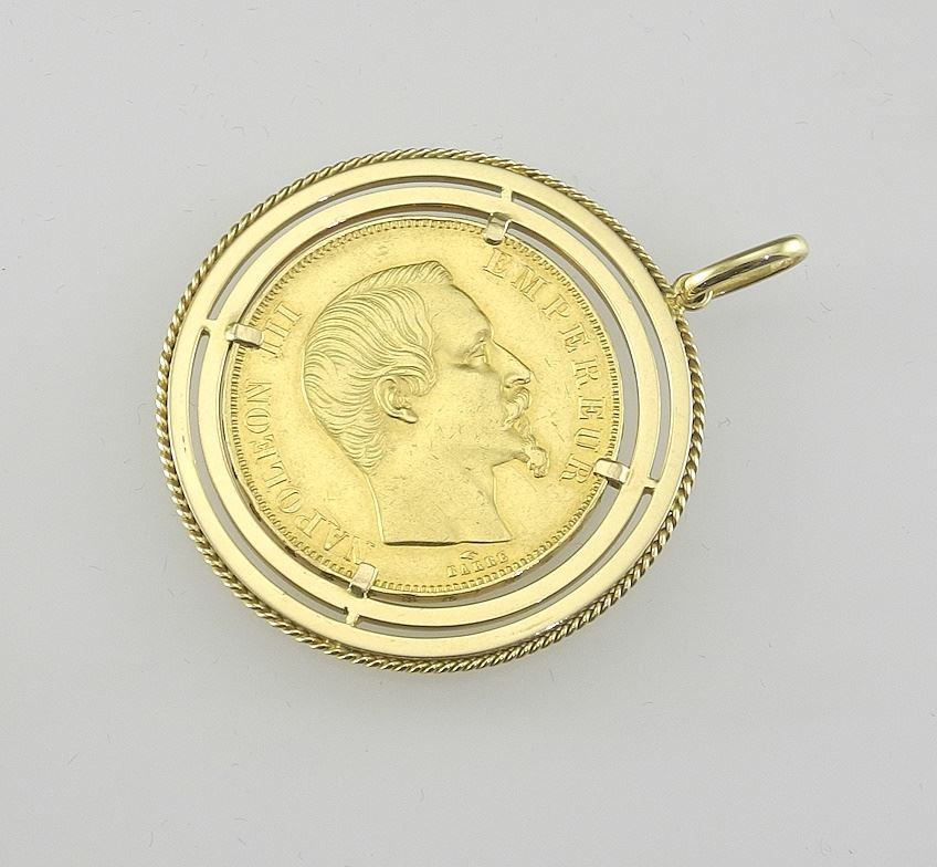 LOT 37 1859 Empire Francais Gold Coin in Gold Frame, TW 24.39g. Estimate: $1,000 - $1,500 Sold For: $1,800 Auction Date: Tuesday, February 25 2025 at 4:00 PM