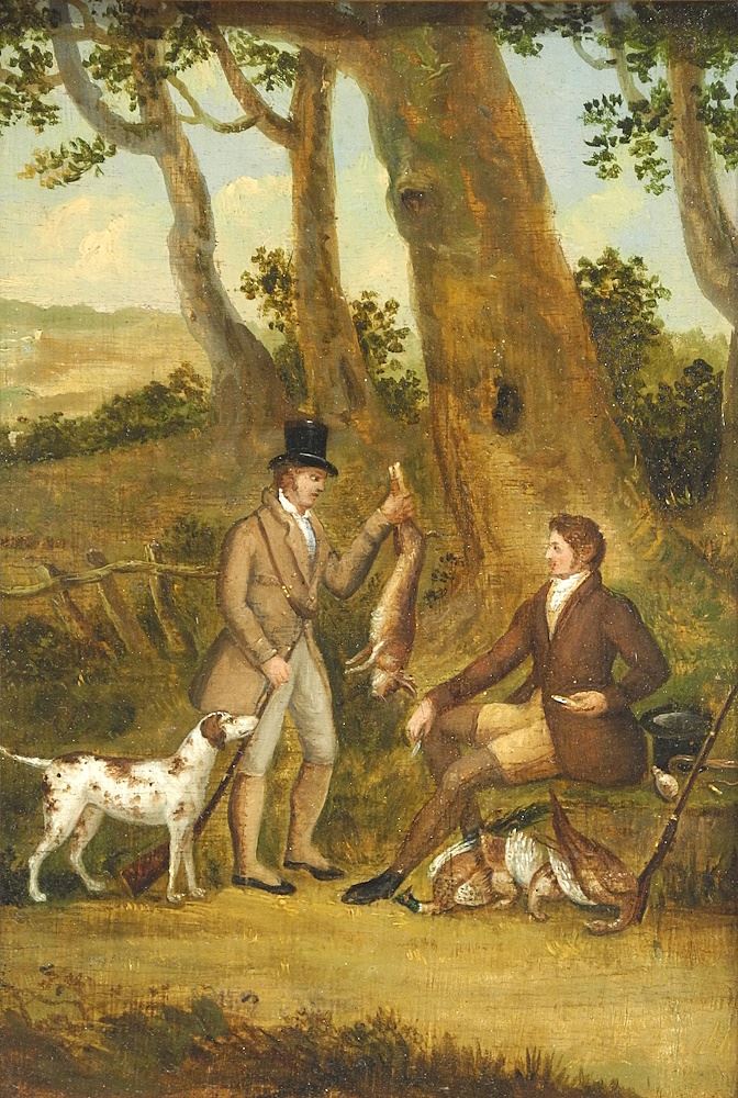 English School 18th C., 12 1/2" x 8 7/8", "Hunters with Hound & Catch"