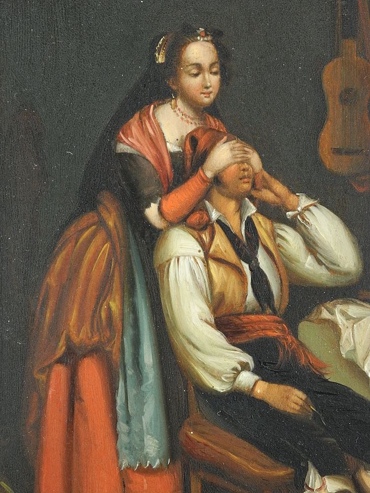 LOT 17 Oil on Board After A.P. de Keyser, 7 1/4" x 5 3/4", "The Surprise". Estimate: $200 - $400 Sold For: $150 Auction Date: Tuesday, February 25 2025 at 4:00 PM